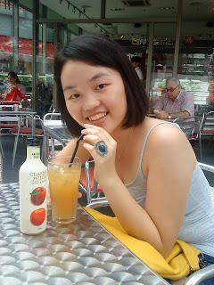 christina with her erm... peach + apple drink. kinda sweet. i like the bottle more than the drink!! ahahaha